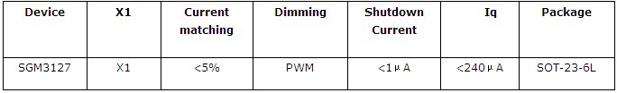 SGM3127作為圣邦微電子新近推出的低壓差模式白光LED燈驅(qū)動(dòng),相對(duì)市場(chǎng)上現(xiàn)有的同類產(chǎn)品,在性能上做了充分的改善,壓差降低到30mA電流條件下小于90mV,可以完美支持4顆LED在較低的電池電壓下(<3.5V)穩(wěn)定工作,工作電壓為2.5~5.5V, 通道間電流誤差小于5%,可以實(shí)現(xiàn)較高的通道亮度匹配度。支持PWM調(diào)光,建議頻率在200Hz~10kHz,啟動(dòng)時(shí)間小于20μs,關(guān)斷模式下,靜態(tài)電流小于1μA,可以充分滿足各種便攜產(chǎn)品的應(yīng)用。
