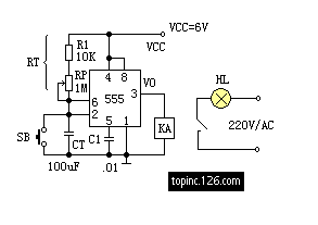 電源接通后,定時器進入穩(wěn)態(tài)。此時定時電容CT的電壓為:VCT=VCC=6V。對555這個等效觸發(fā)器來講,兩個輸入都是高電平,即VS=0。繼電器KA不吸合,常開點是打開的,曝光照明燈HL不亮。